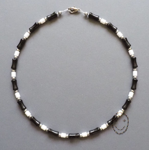 Böhmische Walzen (0,5 cm Durchmesser mittig gemessen, 1,1 cm lang), versilberte Hämatitscheibchen, Acrylwalzen. 42 cm lang. Schwarzweiß passt zu allem.