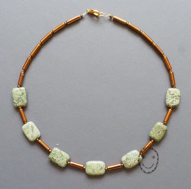 Gerundete Serpentinrechtecke (auch China-Jade genannt), 1,4 cm Durchmesser, 0,5 cm hoch, vergoldete Hämatitwalzen und vergoldete Perlen. 44 cm lang. Es wird gesagt, dass Verspannungen, Krämpfe und Schmerzen gelindert werden.