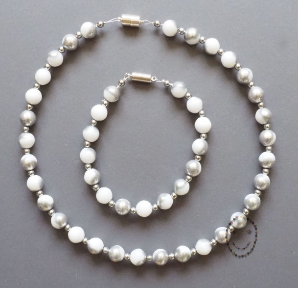 Silber"getupfte" weiße Perlen (1,0 cm Durchmesser), versilberte Hämatitperlen. 44 cm lang. Mit passendem Armband. 22 cm lang. Kette und Armband mit leichtem Magnetverschluss.