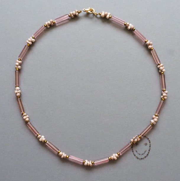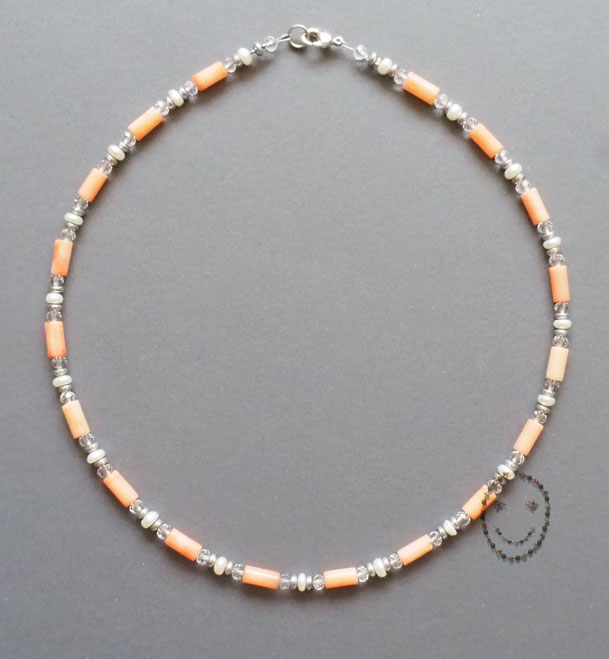 Zarte rosafarbene Korallenwalzen (0,4 cm Durchmesser, 1,0 cm lang), schmale Zuchtperlen, versilberte Hämatitscheibchen, facettierte Bergkristallperlchen. 44 cm lang. Zart und fein - so soll es sein!