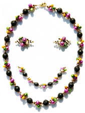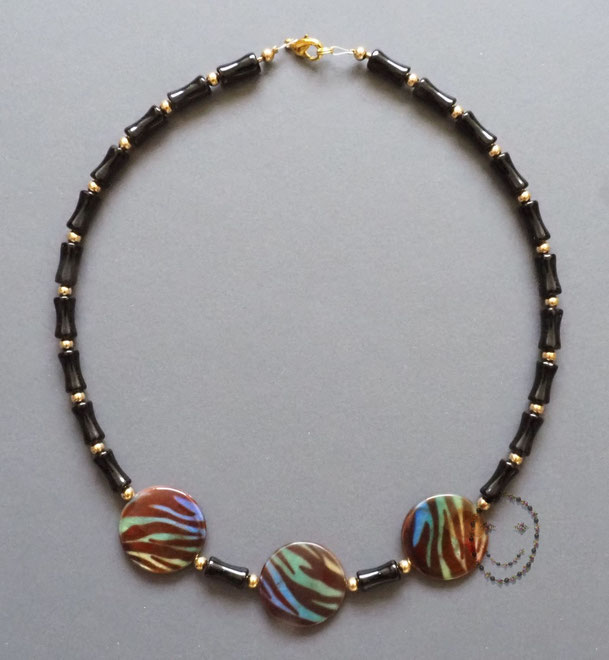 Auf beiden Seiten handbemalte Perlmutttaler (2,4 cm Durchmesser, 0,4 cm hoch), Walzen, vergoldete Hämatitperlen. 43 cm lang und 25 Gramm leicht.