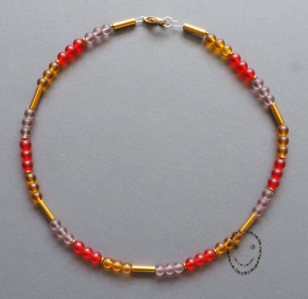 Mattierte böhmische Perlen (0,6 cm Durchmesser), vergoldete Hämatitscheibchen, vergoldete Hämatitwalzen. 42 cm lang. Die mattierten Perlen lassen die vergoldeten Walzen glänzen.